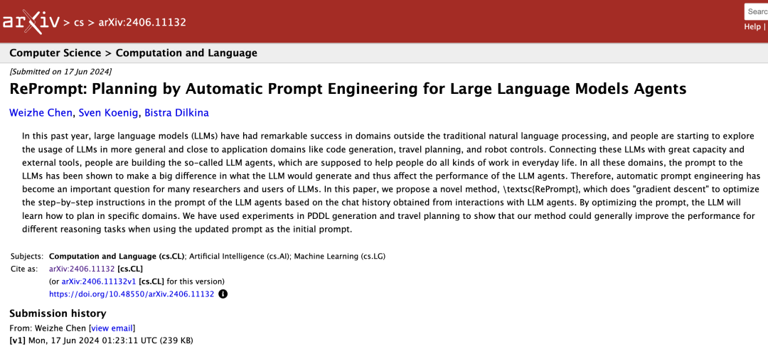 在 LLMs Agent 领域中,给 LLMs 的提示词已被证明对 LLMs 生成的结果有很大影响,从而影响 Agent 性能。因此,自动提示工程已成为研究者研究的重要方向。本文提出 RePrompt,它基于与 LLMs Agent 交互获得的聊天历史,通过“梯度下降”来优化 LLMs Agent 提示中的一步步指令。 通过优化提示,LLMs 将学会如何在特定领域进行规划。